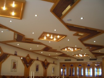 Innenausbau - Saal Wand- und Deckenverkleidung Fichte Massivholz Detail Wandelement Oberfläche honigfarbig / dunkel gebeizt, lackiert